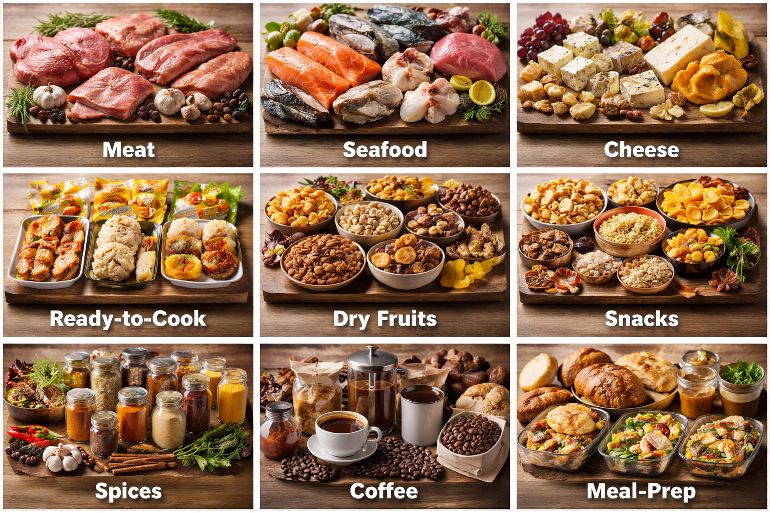 - Meat, cheese, snacks, spices, sauces