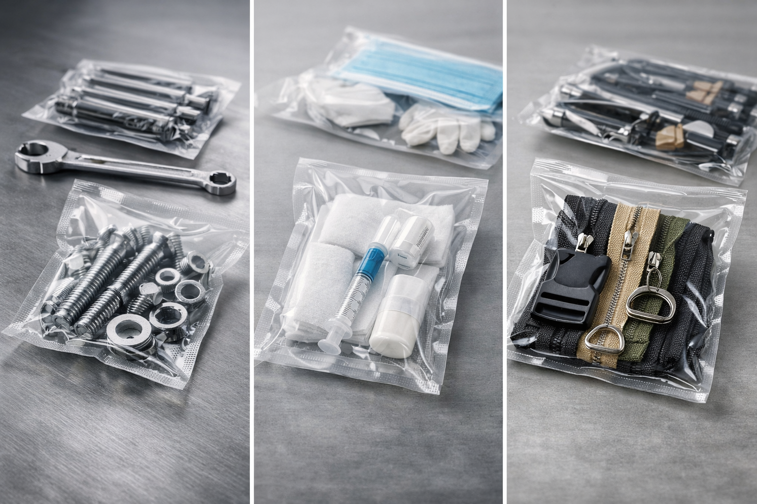 Hardware, medical consumables, textile accessories, components, and specialty items may use vacuum packaging for dust protection, compact packing, and cleaner handling.